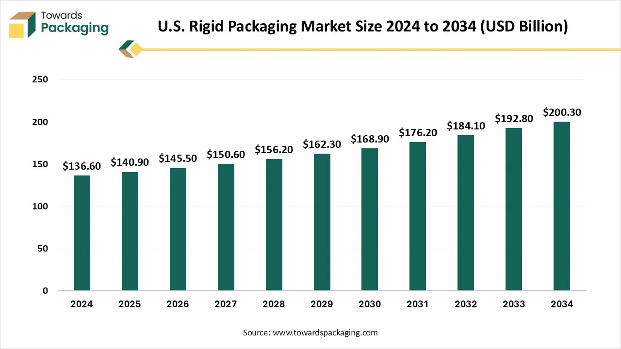 According to projections from Towards Packaging, the global U.S. rigid packaging market is set to increase from USD 145.50 billion in 2026 to nearly USD 200.30 billion by 2034, reflecting a CAGR of 3.9% during 2025 to 2034.
