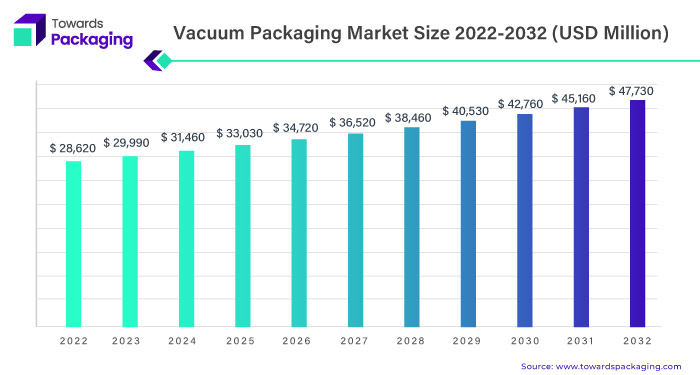 The global vacuum packaging market size is anticipated to hit around USD 47,730 million by 2032 increasing from USD 28,620 million in 2022, a study published by Towards Packaging a sister firm of Precedence Research.