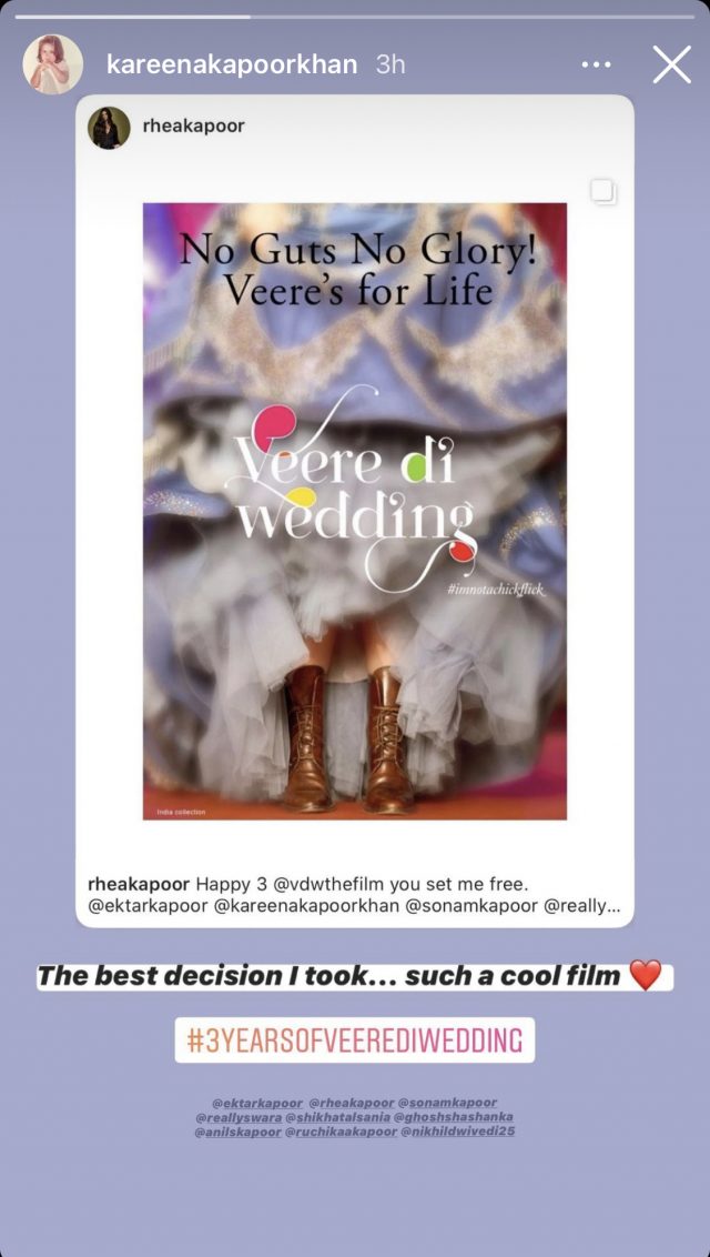 Bebo of Bollywood industry Kareena Kapoor Khan shared a poster from Rhea Kapoor Instagram account as they celebrate three years of ‘Veere Di Wedding’. Kareena Kapoor Khan was latest seen in the character of Deepti Batra in ‘Good Newz’ with Akshay Kumar, Kiara Advani and Diljit Dosanjh.