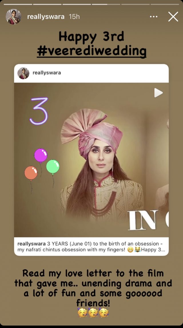 Even Swara Bhaskar took Instagram and shared a piece from her character with a fun caption which says, “3 YEARS (June 01) to the birth of an obsession -my nafrati chintu obsession with my fingers! Happy 3rd to the film that gave rise to an economy: the two rupees per tweet employment guarantee scheme that is seems I launched for my trolls. #veerediwedding #sakshislays So grateful to have been a part of this bomb piece of badassery that only some amazing women, and very cool elevated man could have made”