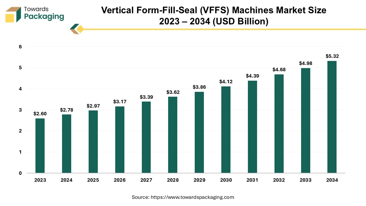 According to Towards Packaging Consultants, the vertical form-fill-seal (VFFS) machines market size stood at USD 2.78 billion in 2024 and is predicted to exceed USD 5.32 billion by 2034, experiencing a CAGR of 6.75% from 2024 to 2034.