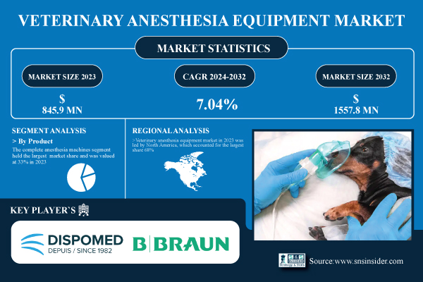 According to S&S Insider, the Veterinary Anesthesia Devices Market was valued at USD 845.9 million in 2023 and is growing at a CAGR of 7.04% during the forecast period of 2024 to 2032 to reach USD 1557.8 million by 2032.