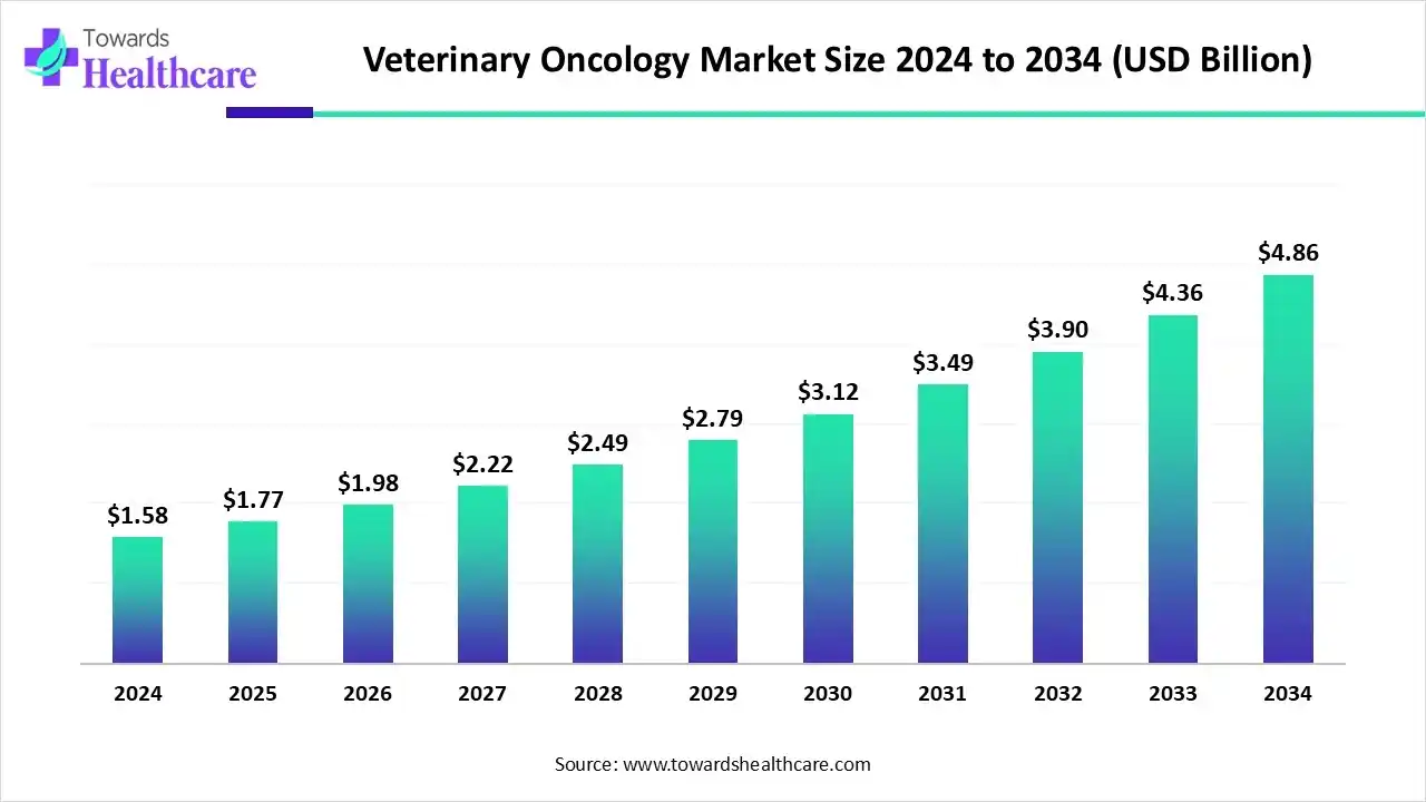 Ottawa, Nov. 19, 2025 (GLOBE NEWSWIRE) — The global veterinary oncology market size was valued at USD 1.58 billion in 2024 and is predicted to hit around USD 4.86 billion by 2034, rising at a 12.14% CAGR, a study published by Towards Healthcare a sister firm of Precedence Research.