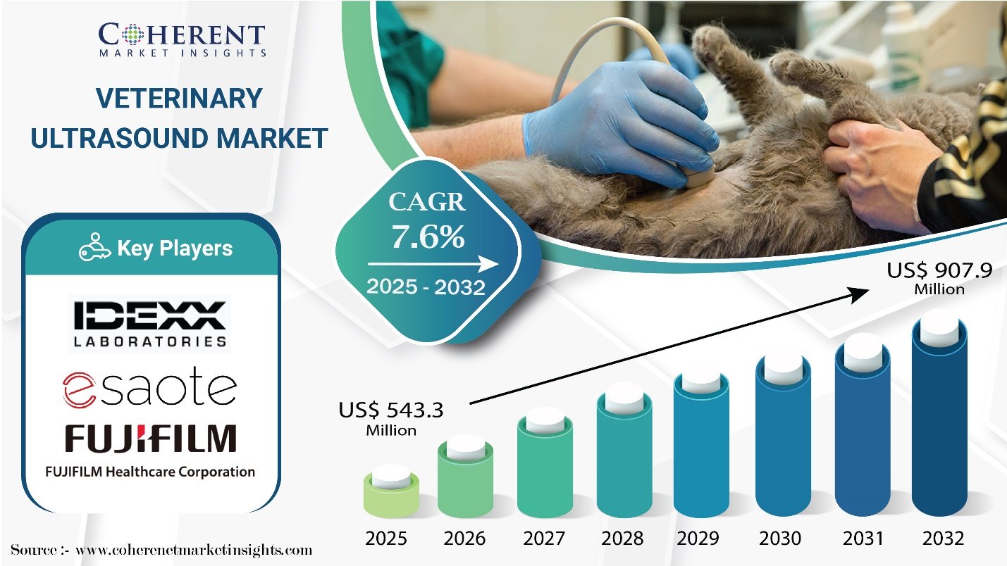 According to Coherent Market Insights (CMI), the global veterinary ultrasound market size is expected to grow from USD 543.3 Mn in 2025 to USD 907.9 Mn by 2032, registering a CAGR of 7.6%.