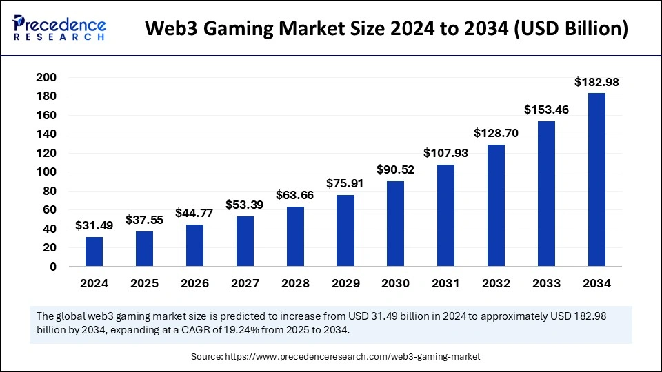 Ottawa, July 08, 2025 (GLOBE NEWSWIRE) — The web3 gaming market was valued at USD 31.49 billion in 2024 and is projected to reach USD 37.55 billion in 2025 with growth expected to reach USD 182.98 billion by 2034, exhibiting a solid CAGR of 19.24% between 2025 and 2034. The increasing investment in gaming, the growth of play-to-earn games, and the integration with DeFi drive market growth.