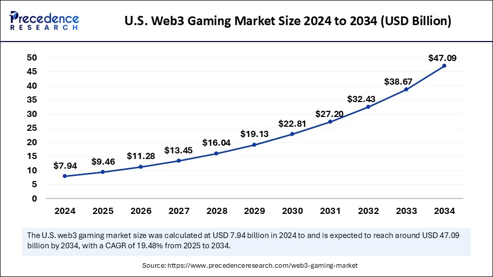 According to Precedence Research, The U.S. web3 gaming market size was valued at USD 7.94 billion in 2024 and is projected to rise from USD 9.46 billion in 2025 to USD 47.09 billion by 2034. The market is poised to grow at a notable CAGR of 19.48% from 2025 to 2034.